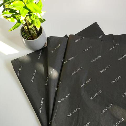 กระดาษห่อพิมพ์ลายสีดำพร้อมโลโก้สีทองสำหรับบรรจุภัณฑ์เสื้อผ้าสบู่
